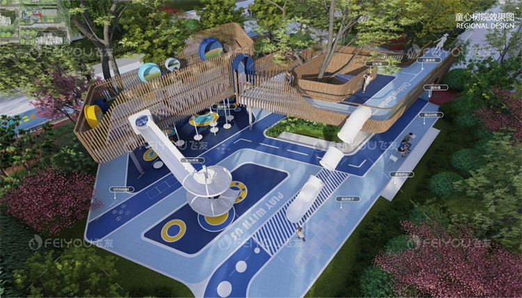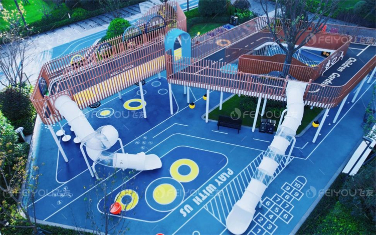 雙層的童心樂園,將綠植與游樂設(shè)施完美結(jié)合,孩子們追逐打鬧的笑聲于綠蔭間環(huán)繞,愈發(fā)凸顯出時(shí)光的美好。